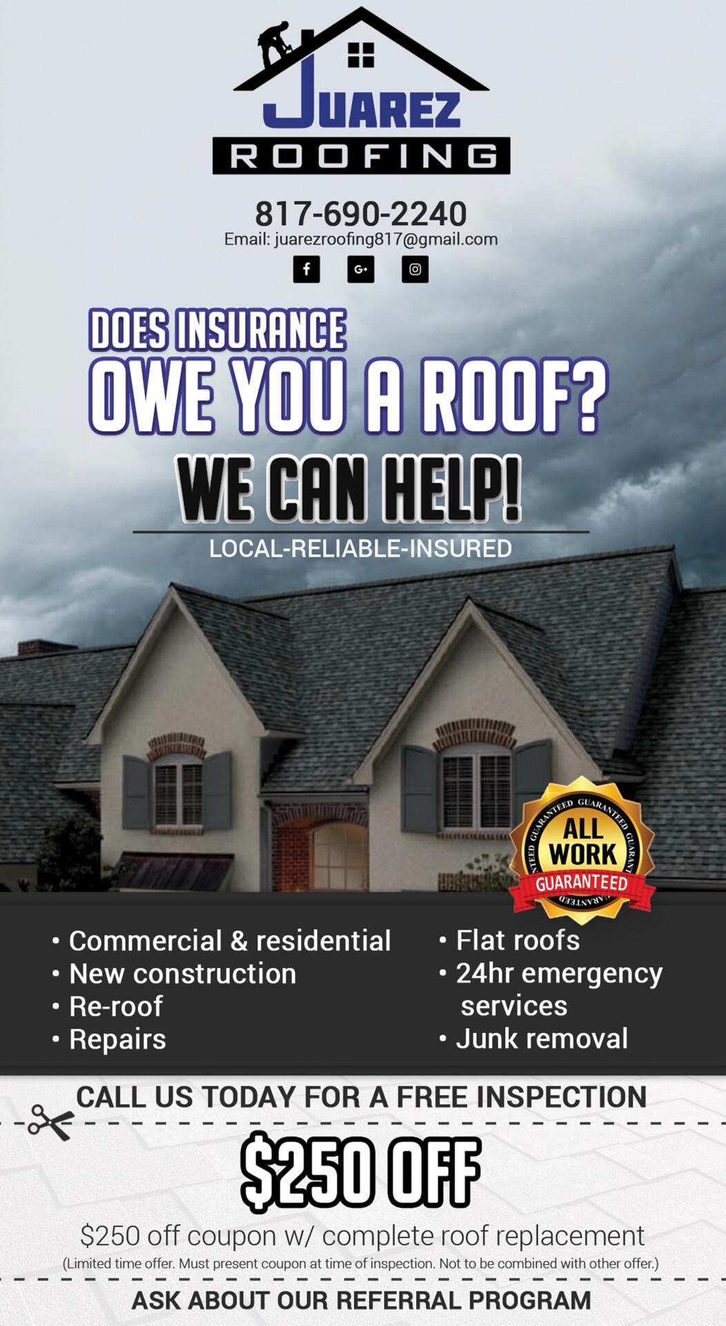 IF YOU'VE BEEN LOOKING FOR A ROOFING COMPANY YOU CAN TRUST THE PROTECTION OF YOUR HOME, LOOK NO FURTHER. JUAREZ ROOFING IS A FAMILY OWNED, FULL SERVICE ROOFING COMPANY BASED OUT OF FORT WORTH, TX. WE SPECIALIZE IN RESIDENTIAL & COMMERCIAL ROOFING. OUR TEAM IS HIGHLY SKILLED, PROFESSIONAL & WILL PROVIDE YOU WITH SUPERIOR RESULTS NO MATTER THE SIZE OF YOUR PROJECT. CONTACT US TODAY TO SCHEDULE YOUR FREE ROOF INSPECTION!